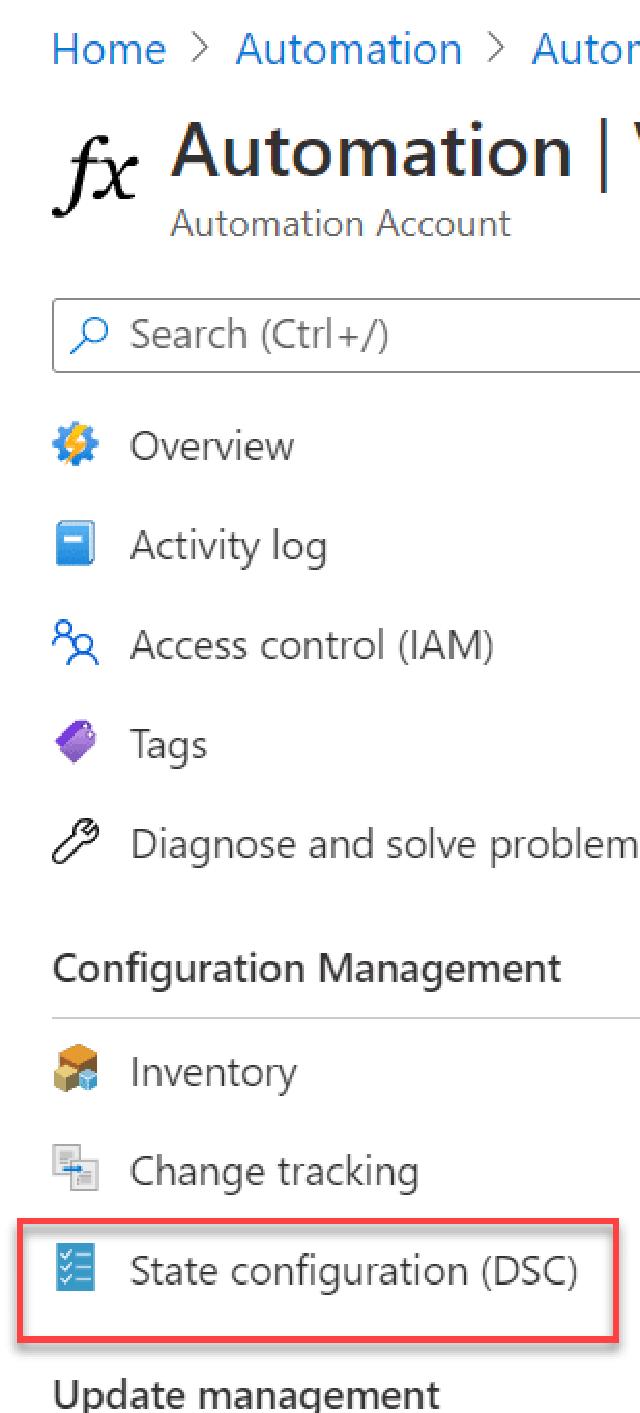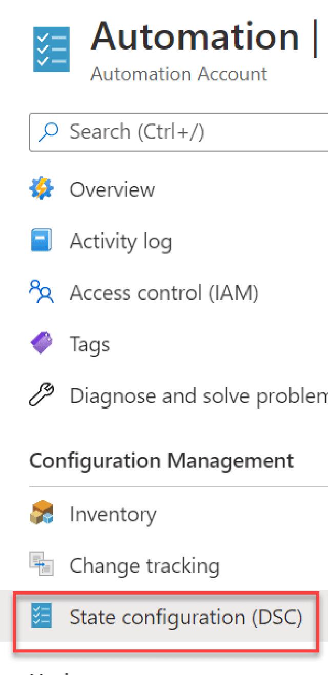 The final part I need to do now is to apply my configuration to the virtual machine. I do this by going to my automation account and click on “State configuration (DSC)”