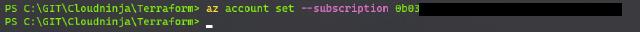 I need to select my account, and I do that with the command “az account set –subscription IdOfSubscription” The ID is shown in the first screenshot.