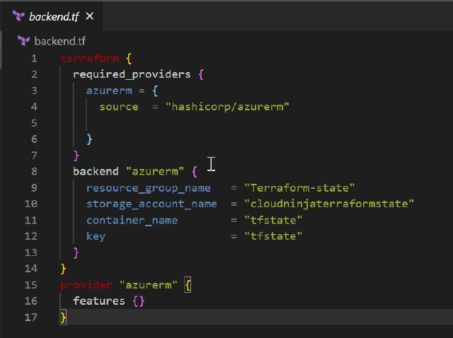 I open Visual Studio Code (VS code) and create my first configuration file named “backend.tf”. I found the required_providers information here. I paste that code into my new file.