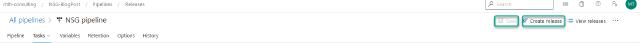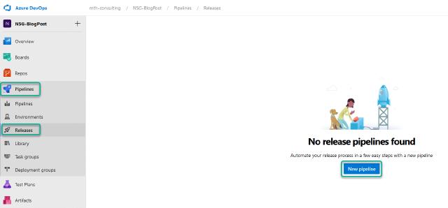 Next, I want to create my release pipeline to deploy my NSG and NSG rules into Azure. To do this, I will click on “Releases” under “Pipelines” and then “New pipeline”.