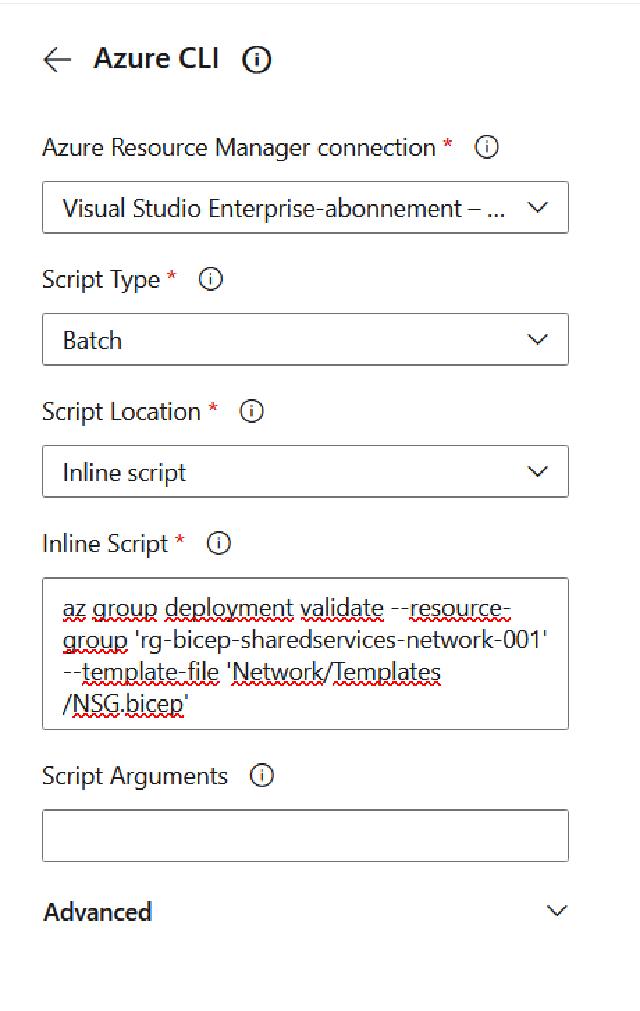 inlineScript: az group deployment validate --resource-group rg-bicep-sharedservices-network-001 --template-file 'Network/Templates/NSG.bicep'