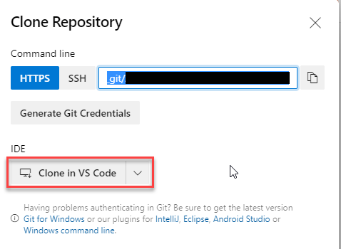 This will bring up the cloning options where the easiest is to click on “Clone in VS Code” which I will do this time.