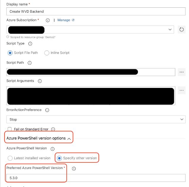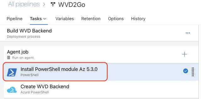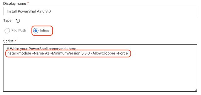 Insert a PowerShell task, name it something like “Install PowerShell module Az 5.3.0”.