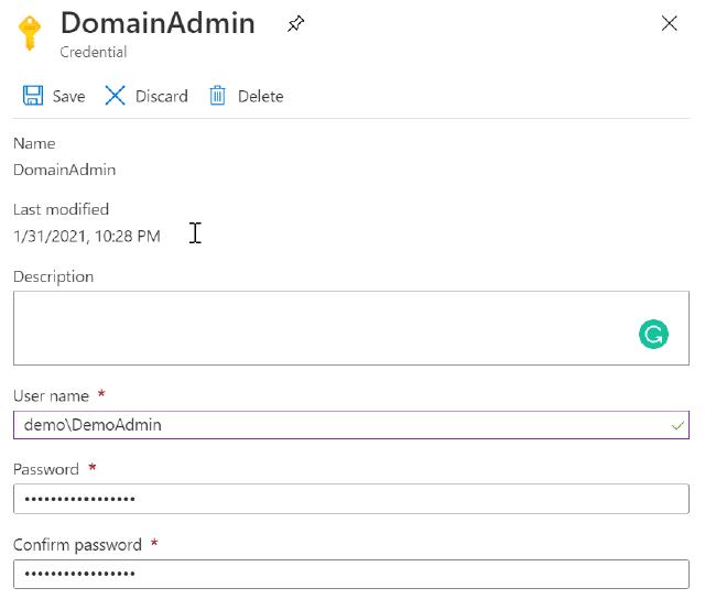 $domainCred = Get-AutomationPSCredential -Name "DomainAdmin"
