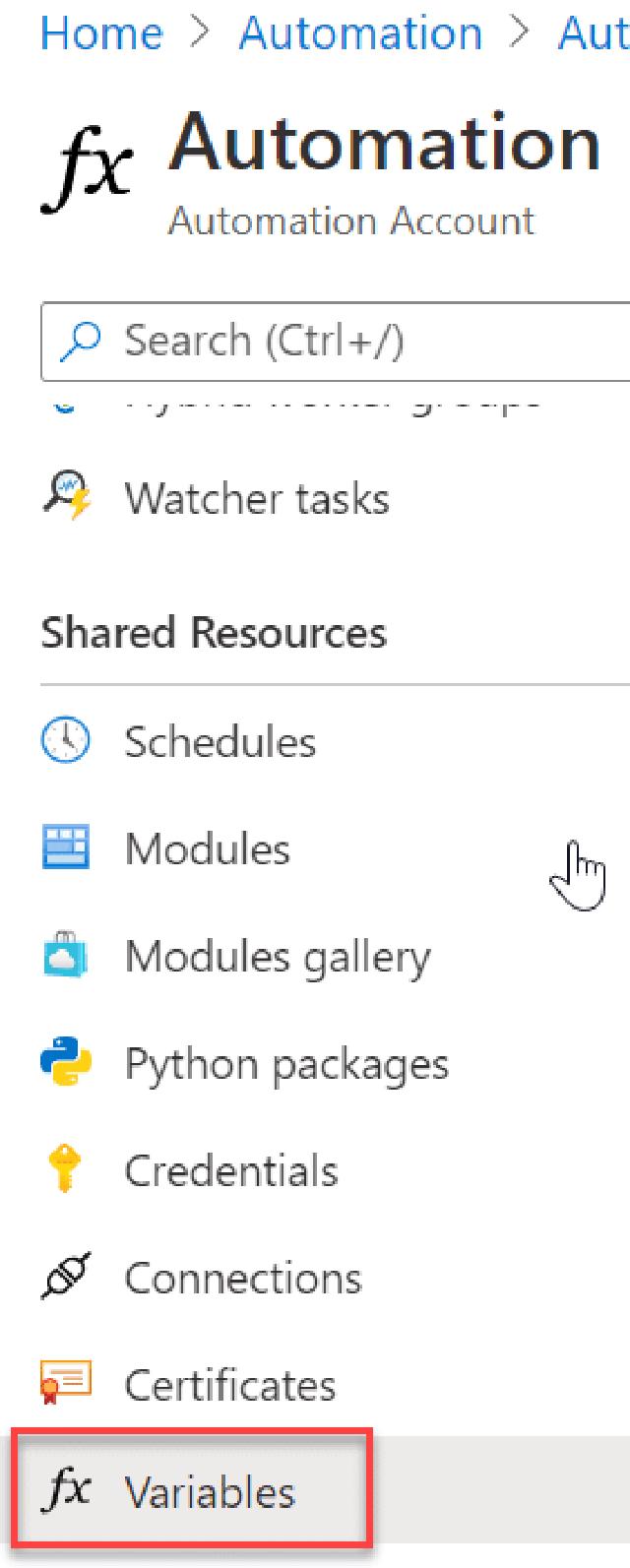 Next, I will add my variables to my automation account, so I click on the “Variables” link on the automation account’s left side.