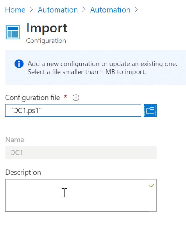 I now have the configuration saved on my local computer, and I now need to upload it into Azure DSC. The PS1 file must be named the same as the configuration name, and in this case, it needs to be “dc1.ps1”. Under my automation account, I click on “State configuration (DSC).