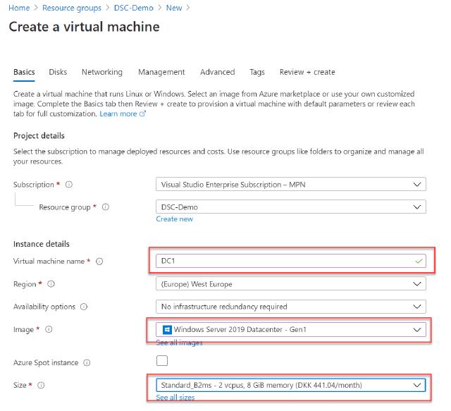 I name my domain controller DC1, choose “Windows Server 2019 Datacenter” as my image, and choose a machine type. I select a B2MS type that will do just fine.