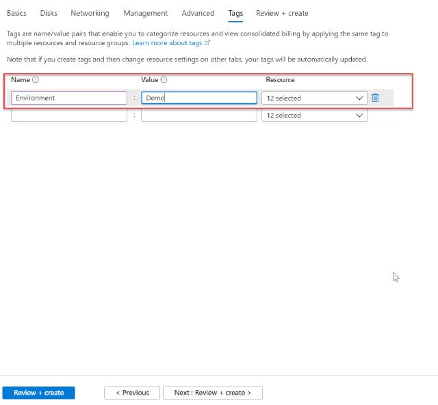 I keep the management and advance page as default, and under tags, I ensure that I know what these resources are used for.