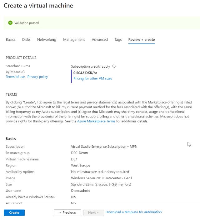 Validation passed just fine, and I now click on “Create” to deploy my new virtual machine for the domain controller.