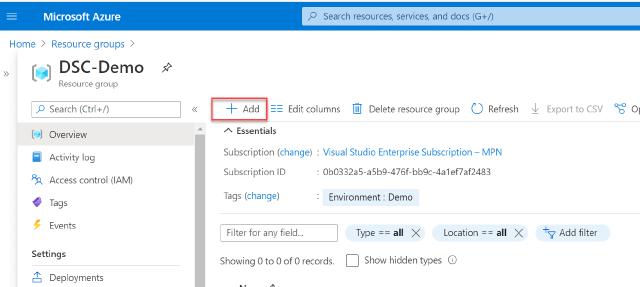 Now that I have the configuration done, I can create a virtual machine in Azure. I go to the resource group I want to use and then click “Add”, as shown below.