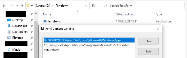 The first step for me is to get Terraform installed and set up to save the deployment states in my Azure Storage Account. The installation of Terraform is a straight forward as can be, I download the software here, and then I unpack the exe file. I create a new folder on my c-drive called Terraform and place the exe file in this folder. I then add c:Terraform to my path variable in Windows. Below is the setup I created.