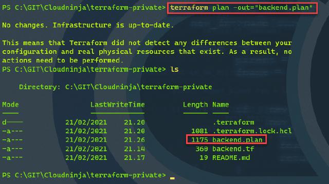 I can see that the backend file is working without errors, so now I can run “Terraform plan -out=‘backend.plan’” to save my current configuration. Notice that a new file is created with contains the plan for deployment.