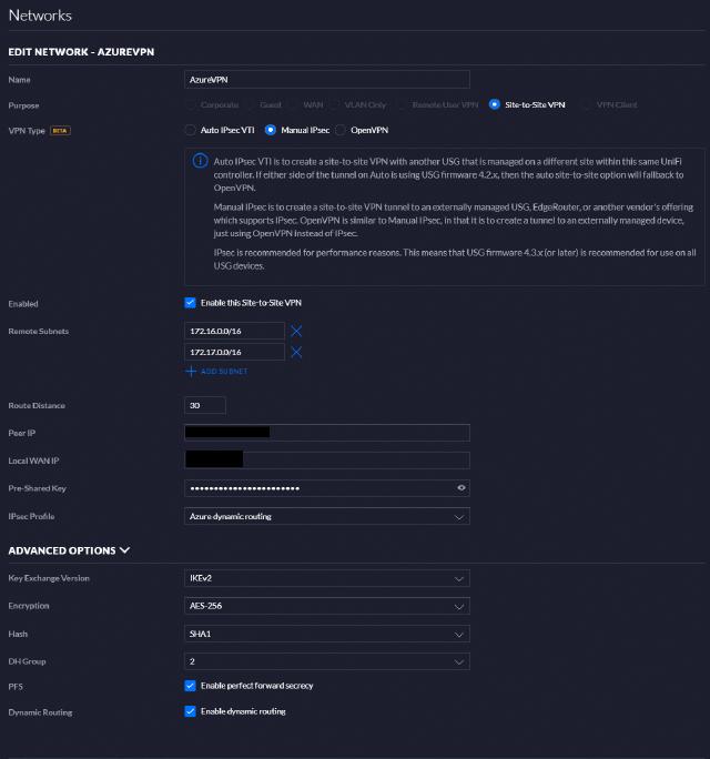 When the deployment is complete, I can update my local VPN endpoint with the public IP address. In my case, this is a Ubiquiti USG that handles my VPN, so my configuration is as shown below.