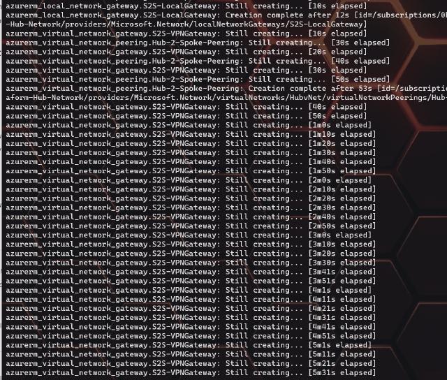 I can now run the command “terraform plan -out network.plan” again to create the updated network plan. I can now deploy the updated plan with the ’terraform apply “network.plan”’ command. The deployment takes over 30 mins in my case, and will look something like the image below.