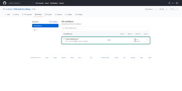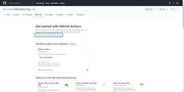 To create an action in GitHub, I click on the “Actions” tab under my repository. It is possible to use a template provided by GitHub, but I choose to start my own by clicking “Skip this and set up a workflow yourself”.