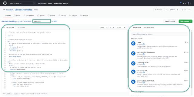GitHub delivers the structure to create the action and with some samples set up already. On the picture below I have highlighted the name section where I call my action “deploy.yml”. I also highlighted a section in the code when it is shown the action is using continuous integration (CI) and that it will execute on push to the main branch and pull request to the main branch. Most of the remaining code will be deleted since it is not what I want to use. The last section I have highlighted is the marketplace, where I can search for snippets and integrations with an external system. I will get a bit more into that later in this post. For now, I will click on “Start commit” and “Commit new file”.
