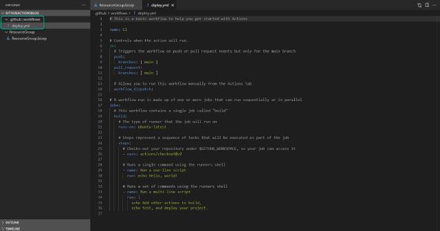 With the code in place, I can now edit my actions to use this bicep file to create my resource group. To do this, I use VS Code to edit the deploy.yml file. As you can see below, the file is located in the “.github/workflows” folder.