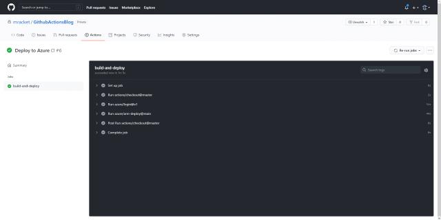 I will save the updates and commit my changes to the repository. Next, I can open the actions tab on the GitHub page to view the deployment state of my new changes. The picture below shows that the deployment went fine and that my resources should be deployed as expected.