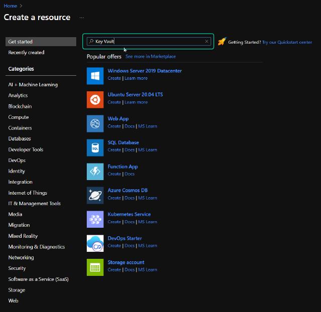 First, I will need to create an Azure key vault and add my secrets into the key vault. I will go to the Azure portal and click on “Add a resource”.