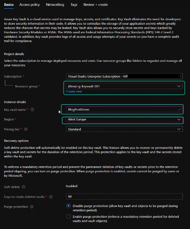 I will create a new resource group called “rg-keyvault-001” and provide the name “BlogPostDemo”, and I want the location to be in West Europe.