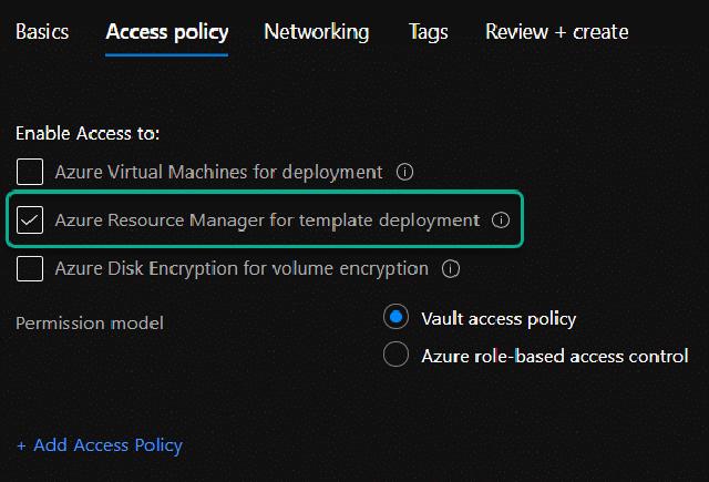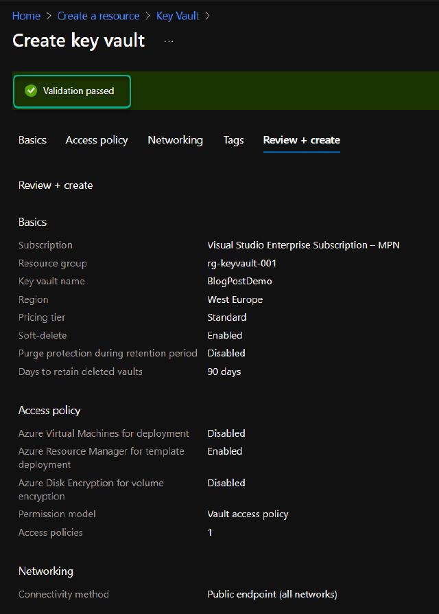 I will allow ARM access to the key vault for template deployments and click on “Review and create”, this permission isn’t strictly needed in this demo, but I like to have that permission set so I can use it inside ARM templates.