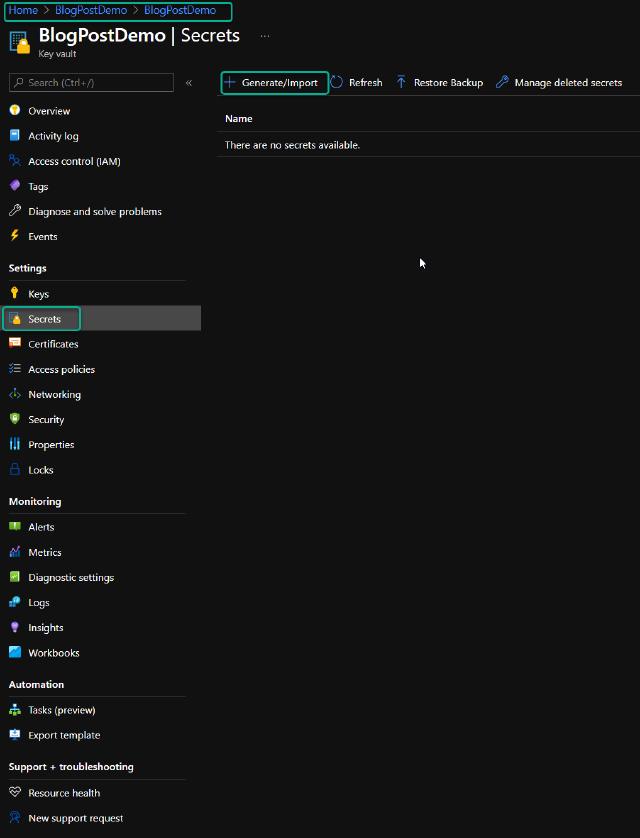 When the deployment has completed, I can go to the resource and add my secrets. In the navigation pane on my key vault, I click on “Secrets”, and I can then click on “Generate/Import” in the midsection.