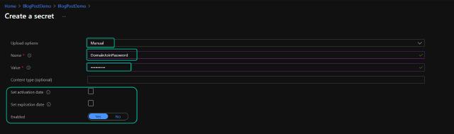 I choose the manual option for upload and provide a name for my secret. Here, I am creating the domain join password, so I will call it “DomainJoinPassword” and I will type in the password I am using for my service account. I could choose to set dates for activation and expiration, but I will leave those unchecked and ensure that the secret is enabled.