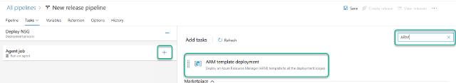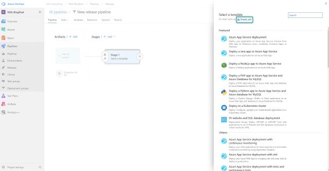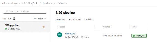 Next, I want to create my release pipeline to deploy my NSG and NSG rules into Azure. To do this, I will click on “Releases” under “Pipelines” and then “New pipeline”.