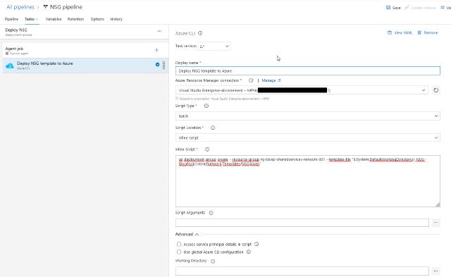 I do want to cover one last thing before I round up this post. As you may have gathered already, creating both a build pipeline and a release pipeline is actually not needed. You can do just one and have both the validation and deployment done from either type of pipeline. Below is a code example of using the build pipeline to validate and deploy the NSG and rules.