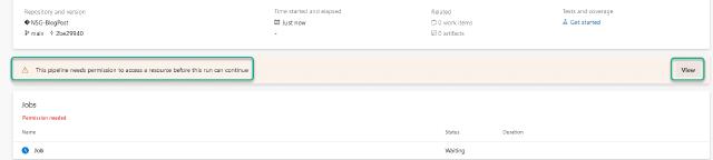 I will be asked to provide permission to run the pipeline, so I will click on “View” and then on “Permit”
