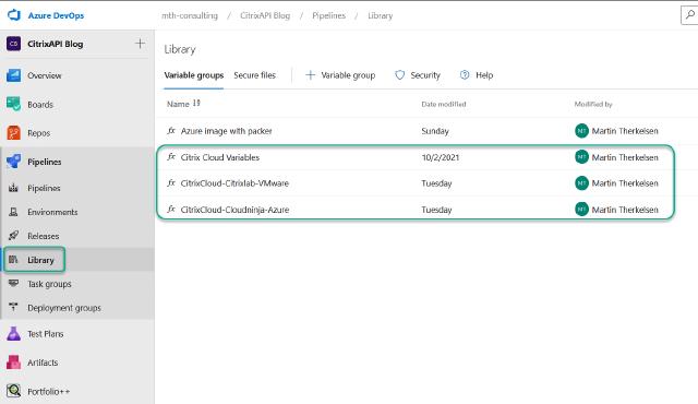 The first step is not creating the pipeline but creating variables groups in the “Library” under “Pipelines.” As shown below, I have three variable groups, one shared which is the “Citrix Cloud Variables,” this contains my client id, client secret, and customer id for Citrix Cloud. The other two are one for on-premises variables and one for Azure variables.