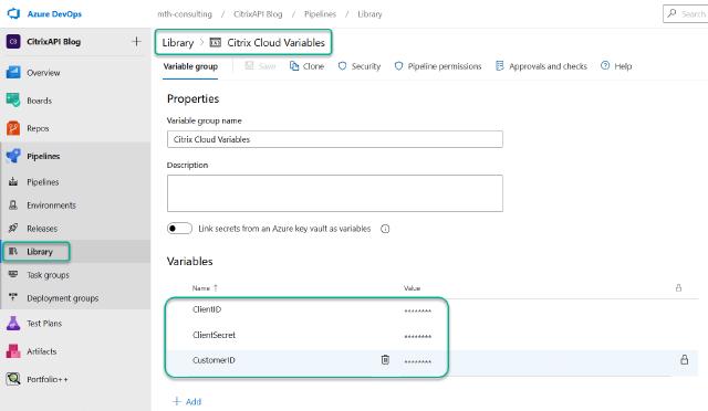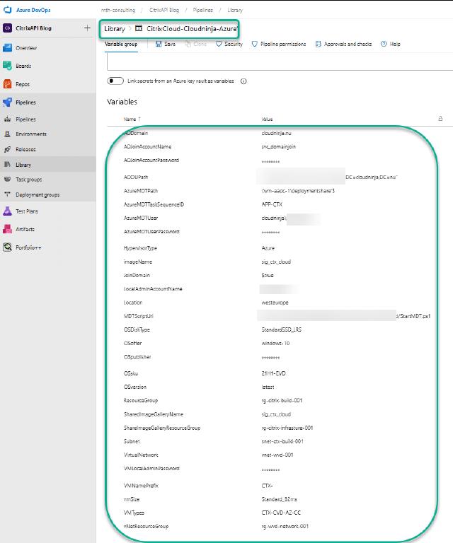 If we look at the “Citrix Cloud Variables” group, we can see the following variables. Notice that I have hidden all the values. Hiding the values in the group will also hide the value from any log generated inside of Azure DevOps. I also cannot unhide the value. If I have forgotten what it was, I have to reenter it, which would probably mean I need to create a new API client in Citrix Cloud.