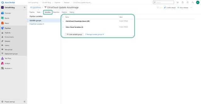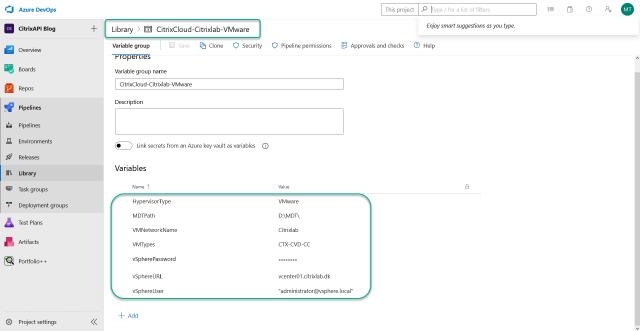 The last part of the pipeline is to link my variable groups. Adding a variable group is done quickly under the “Variables” tap and “Link variable group.” As you can see below, I have two groups linked, one for Citrix Cloud and one for Azure. For my on-premises deployment, I have Citrix Cloud and VMware groups linked.