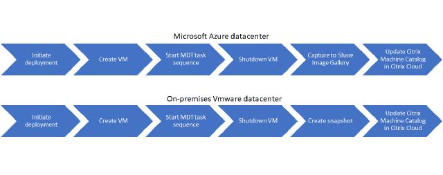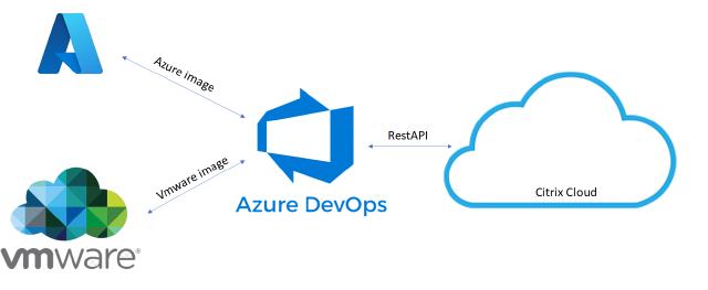 In this blog post, I want to show you how to create Citrix images using Azure DevOps and publish them to Citrix Cloud via the RestAPI. I will show you that Citrix images can run both on-premises and in Azure (or any other cloud, but outside this scope). I am using Citrix Cloud, Azure DevOps, Azure IaaS, VMware ESXi, and Microsoft Deployment Toolkit (MDT) for this blog post. Now I won’t get much into the MDT configuration and use, but I am using it in both the on-premises and Azure deployments. I will be using Azure DevOps Pipelines to execute my code to deploy new images without touching a GUI. Below I have shown the basic workflow for both on-premises and in Microsoft Azure.