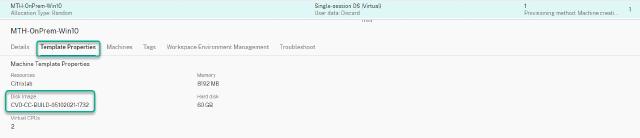The last thing I want to highlight in the Citrix Cloud setup, for now, is that each catalog uses a template. In the two pictures below, notice the “Disk Image” section, where we have the version of the current image. The first picture shows my on-premises environment, and the second is my Azure environment.