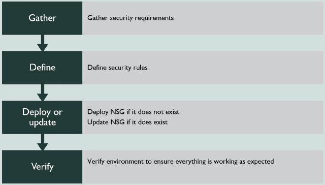 The process surrounding NSG is pretty straightforward. We need to know which requirements we have for security, define our rules and then deploy them to an NSG. If one does not exist, we need to create one. We ensure that lockdowns are in place and that applications are still working as expected when deploying rules.