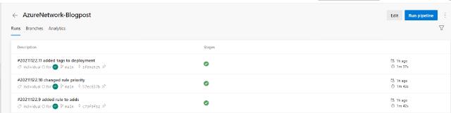 With the pipeline above, I can edit my NSG rules and routes in VS code, and when I commit my changes to the main branch, it will update my Azure environment. Using pipelines enables me to work in a pleasant developer environment and have the confidence to update rules and deploy them into production any time I feel like it. Below is a snippet of some of the commits I have done on my repository. Just reading the comments provides information I can use to see figure out what was changed.