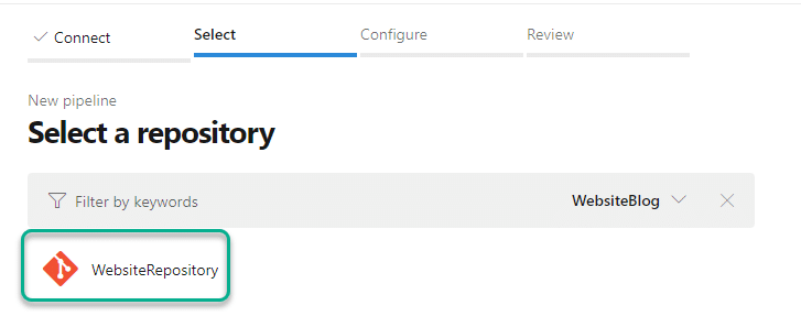 I select “Azure DevOps” and set my account and project. I can provide a name for the repository. I have named it “WebsiteRepository.”