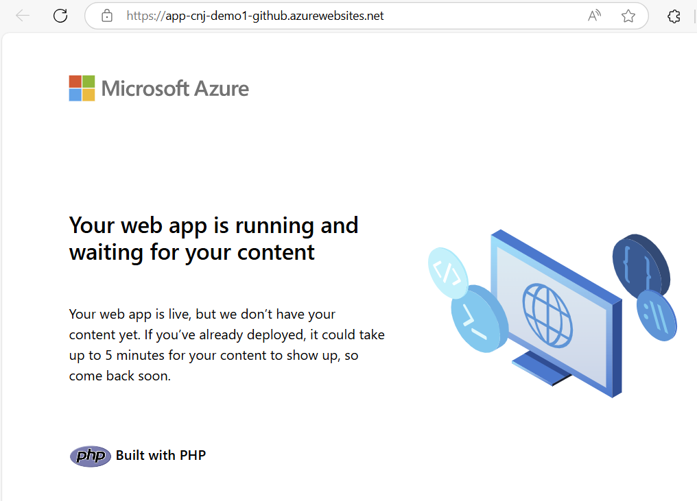 To verify that my deployment worked as expected, I can check the Azure Portal for service status and click the URL for the app service. Below is a screenshot of the service in the Azure Portal, and another is where the service shows the website it is hosting.