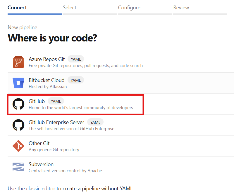 I click on “GitHub” since I use the same repository for the pipeline and GitHub Action. The process for using the Azure DevOps repository is the same.